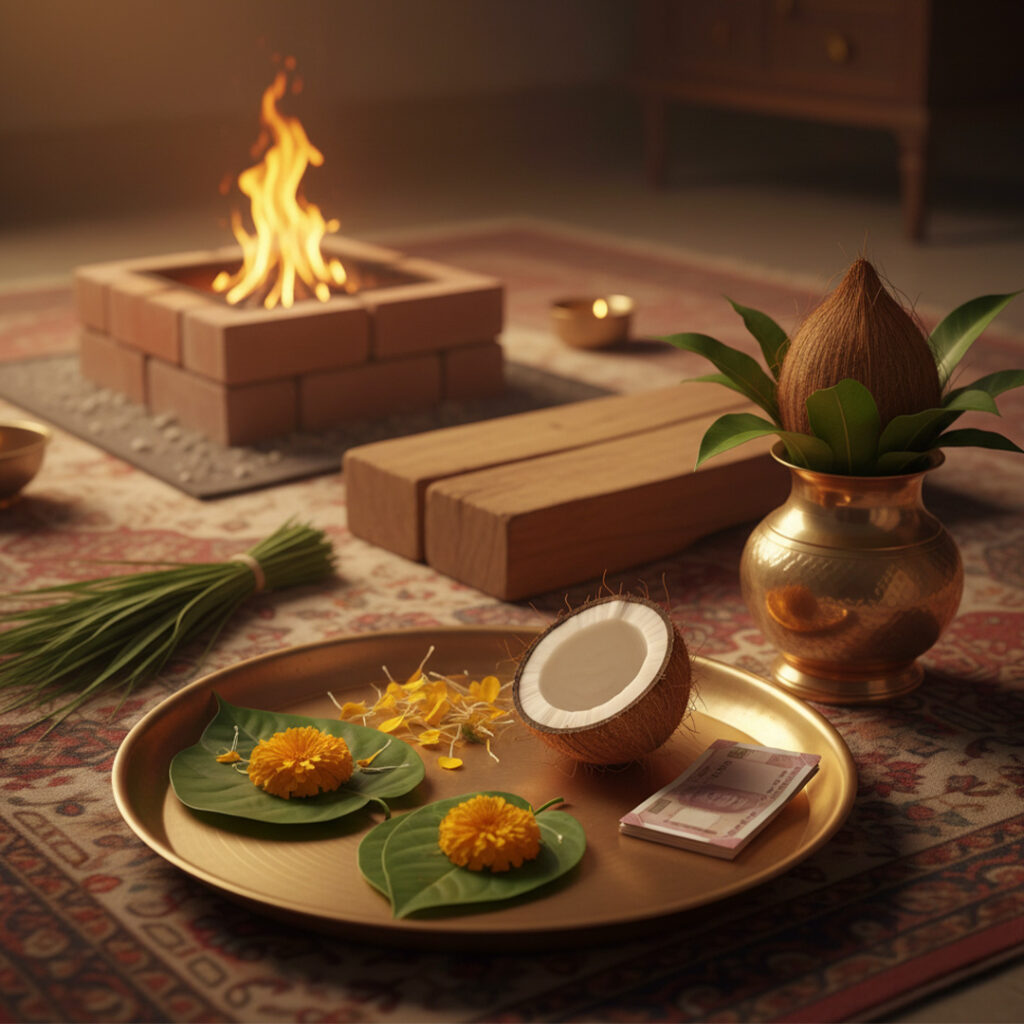 Complete ritual fire setup with all required samagri, vessels, and traditional materials.